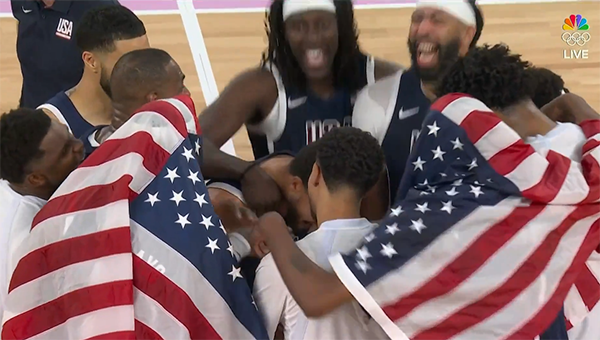 美国夺冠后疯狂庆祝曝光,库里拿着美国国旗怒吼后,全队围着库里跳舞狂欢,杜兰特和阿德巴约都身披美国国旗。之后詹姆斯和杜兰特紧紧拥抱库里庆祝夺得金牌。