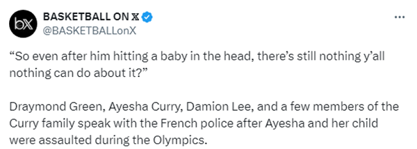 来源:24直播网08-12 12:0724直播网讯 北京时间8月12日,据美媒报道,美国男篮夺得巴黎奥运会金牌后,库里的家人在法国街头遭袭击,库里三个月大的小儿子被打到头部;库里家人与法国警察对峙,阿耶莎泪流满脸,追梦质问警察:孩子的头被打了,你们还是无能为力?