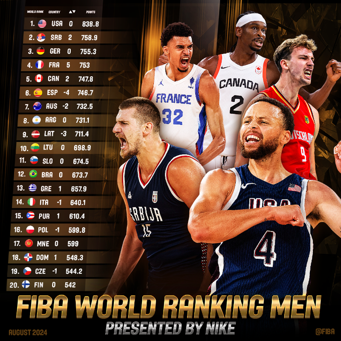 美国队凭借在巴黎奥运会上成功夺得金牌的卓越表现,继续稳坐世界排名第一的宝座。他们在奥运赛场上展现出的强大实力和统治力,再次证明了其在篮球领域的霸主地位。
