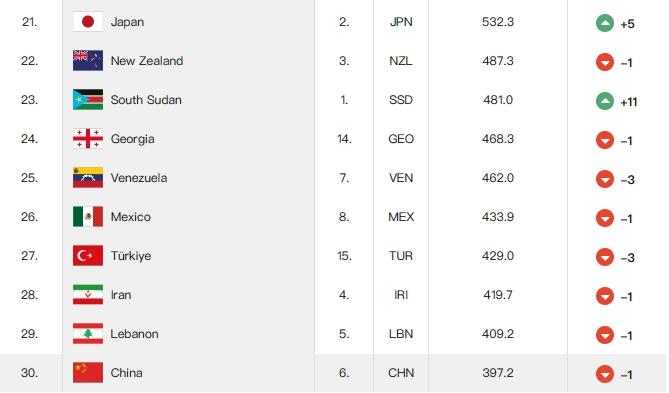 值得一提的是南苏丹男篮,他们在本次奥运会上实现了重大突破,有史以来第一次参加奥运会便获得了奥运首胜。这一优异表现让他们的排名提升了 11 位,升至第 23 位,成功超越科特迪瓦,成为非洲排名第一的球队。
