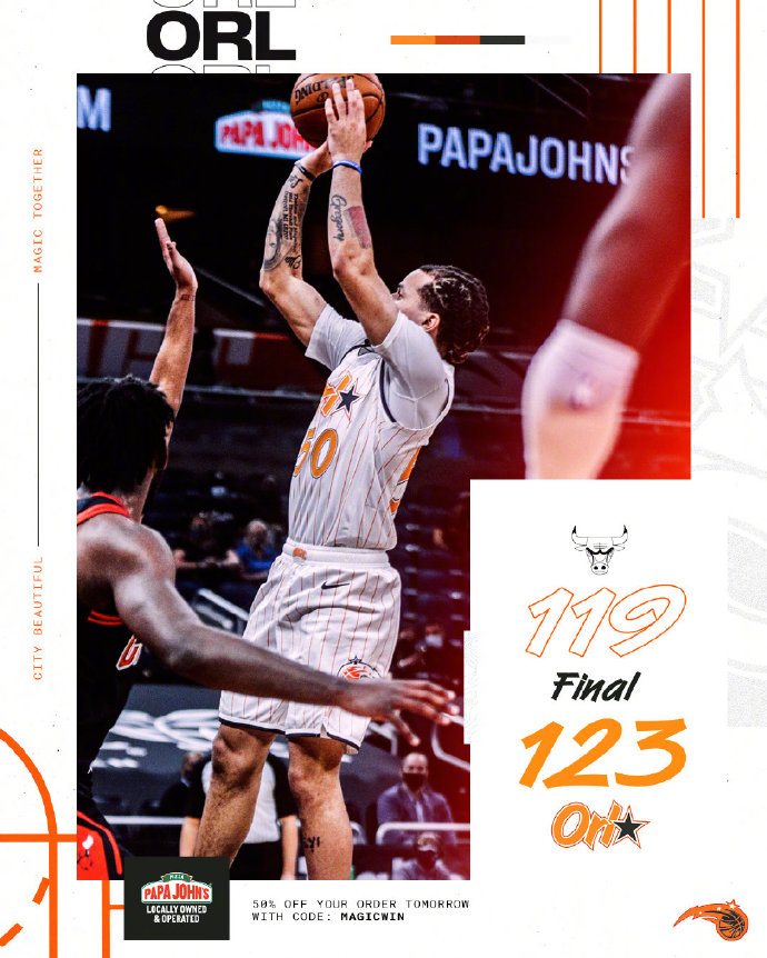 24直播网2月6日讯 魔术今日坐镇主场迎来公牛的挑战,首节开局魔术凭借着武切维奇连中三记三分独得11分的表现早早就取得18-4的领先,然而随后他们状态迅速回落并被公牛连续打出反击,原本16分的优势转瞬之间就变成了2分,次节公牛咄咄逼人的攻势一度反超比分,不过节末富尼耶突然爆发,他一人独砍14分带队打出23-7的攻势一举取得10分领先进入下半场。第三节武切维奇依旧是魔术最好的进攻点,也正是他在节末连拿8分的表现帮助魔术重新取得两位数领先,前三节仅得2分的拉文在第四节的爆发给了公牛希望,他这一节独砍24分一度抹平分差,不过最后时刻公牛没能延续势头反超比分,反倒是富尼耶拿下关键4分奠定胜局。最终,魔术险胜公牛结束4连败。