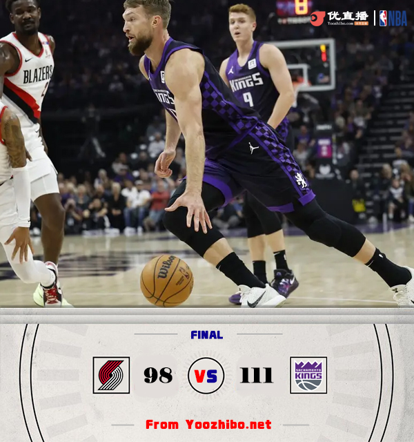 24直播网10月29日讯 NBA常规赛,国王对阵开拓者,国王目前2连败还没取得一场胜利,开拓者上场比赛击败鹈鹕取得赛季首胜。开场后萨博尼斯和许尔特一内一外连连砍分帮助国王15-4开局,艾顿篮下连续打进止血,国王则不断造成犯规获得罚球机会。第二节上来开拓者发动反击将分差追到只差1分,德罗赞连续砍分帮助国王稳住阵脚并再将比分拉开。易边再战,福克斯和许尔特外线连续开火拿分,萨博尼斯在内线也接连得手,国王攻势连连将分差拉大到两位数,第四节国王三分依旧弹如雨下,场上分差来到20分开外,比赛失去悬念,最终国王111-98轻松击败开拓者取得赛季首胜。
