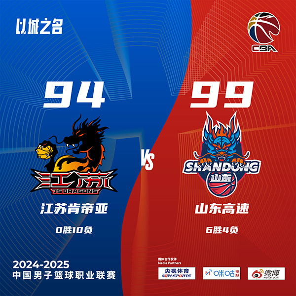 24直播网11月3日讯 CBA常规赛首阶段收官战,江苏主场迎战山东,开赛至今江苏苦吞9连败,是目前联盟唯一不胜球队,山东上场力克北控,目前5胜4负排在联赛第10位。此役开打后双方陷入缠斗,山东双外援克里斯和盖利联手取分,蒋浩然连投带罚强势回应,末段江苏开始发力后来居上,首节结束时江苏领先2分,次节回来,双方进攻均陷入停滞,两队单节得分均未超过20分,蒋浩然联手崔晓龙率队保持优势,半场战罢,江苏依然领先1分。易边再战后江苏外援特奎维恩-史密斯突然爆发,单节飚中4记三分狂砍21分,末段场上形势风云突变,山东回敬11-2攻击波夺回优势,三节结束后山东反超1分,末节决战,两队你来我往交替领先,决胜时刻高诗岩造杀伤罚球拿到本场首分,江苏追分未果,陈培东联手盖利终结悬念,最终山东99-94击败江苏送对手开局10连败。