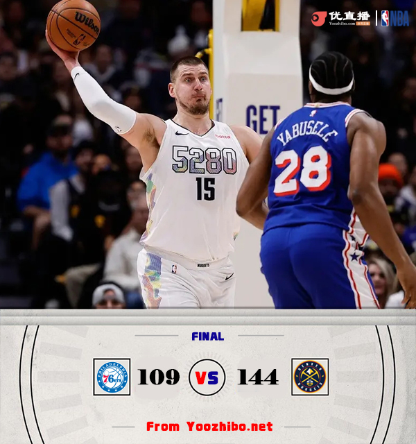 24直播网讯 北京时间1月22日讯 NBA常规赛,掘金主场迎战76人。掘金26胜16负稳居西部第四,76人15胜26负排东部第十一,近期更是遭遇6连败。恩比德继续缺阵。一开场,双方短暂相持,随后掘金内外开花一举取得两位数优势,乔治三分止血,次节双方围绕10分左右分差展开拉锯战,掘金连中三分,马克西内外开花顽强咬住,半场战罢掘金77-67领先76人。下半场,掘金延续火力,多点开花将优势扩大到20分以上,末节掘金稳扎稳打,76人大势已去无力回天。最终,掘金144-109大胜76人,送给对手7连败。