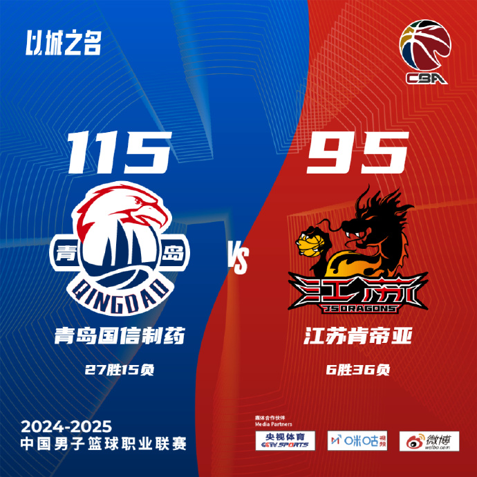24直播网3月19日讯 CBA常规赛,青岛主场迎战江苏。青岛26胜15负排在联赛第9,江苏6胜35负联赛垫底。一开场,江苏打出8-3的开局,青岛轮番冲击篮筐频频得手迅速扳平比分,此后双方陷入缠斗,青岛持续发力打出10-0的攻击波确立两位数优势,江苏不断杀入内线拿分努力追赶,半场战罢青岛63-54领先江苏。下半场,青岛攻防两端压制对手,一举将分差拉开到20分以上,末节青岛稳扎稳打将优势保持到最后,最终,青岛115-95大胜江苏,送给对手8连败。