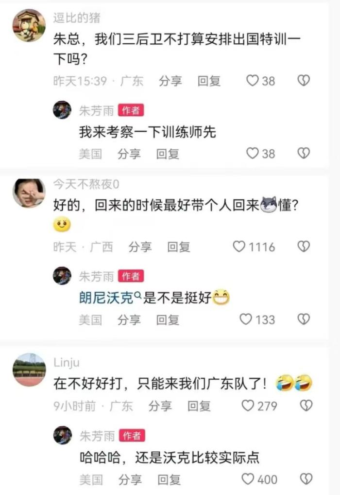 身处美国,开始忙碌,朱芳雨的举动也是牵动着无数球迷的心,特别是近期,胡明轩交易北京首钢范子铭的传闻一度上了热搜,这也让很多球迷关心起胡明轩的动向。在朱芳雨前往美国之后,也是有球迷试探的询问要不要安排广东三少前往美国集训,朱芳雨也是回应:我先来找训练师。