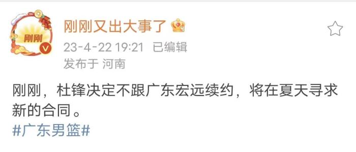 杜锋合同到期,大多数球迷认为杜锋肯定是不会离开广东男篮的,毕竟从梦想起航到如今的冠军教练,广东男篮把最好的都给了杜锋。可是在4月22日,拥有数十万粉丝的名记“刚刚又出大事了”在社交媒体上报道:“刚刚,杜锋决定不跟广东宏远续约,将在夏天寻求新的合同。”