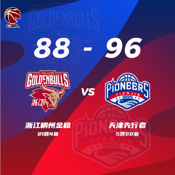 末节,赖特中距离命中,韦瑟斯庞反击一条龙得分。程帅澎正面三分开火,韦瑟斯庞两次突破再中,赖特罚球线踩一步抛投得分。吴前底线抛投得分,王一方两次高打板上篮得分。杰弗森关键三分将分差拉开到六分,时德帅上篮将比赛手下。天津队力克浙江,全场比赛结束,浙江88-96不敌天津。