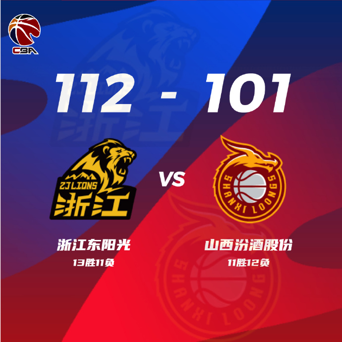 广厦112-101力克山西 胡金秋26+14 孙铭徽16+15 威尔哲26+11