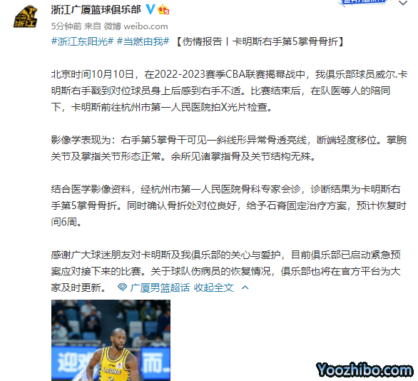 卡明斯首秀表现不俗之后受伤,而本赛季的浙江广厦确实太难了,除了遭遇联赛开门黑之外,队内的核心之一、MVP球员胡金秋上个赛季季后赛受伤,秋脾脏破裂、出血,接受了手术,无缘中国男篮的比赛。复出之后再度受伤,对战山东男篮的热身赛中,胡金秋小腿骨折,预计伤缺时间也是6周。