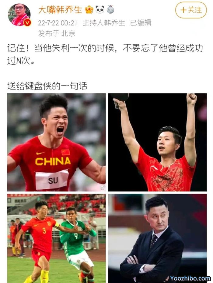 因为失败一回就要背上私心的人设?或许著名体育记者韩乔生的话语是最好的解答,在男篮输球之后,当杜锋被骂上热搜后,韩乔生发布了4张图片,他们分别是苏炳添、马龙、杜锋等人,韩乔生表示:记住,当他失利一次的时候,不要忘了他曾经成功过N次,送给键盘侠的一句话。