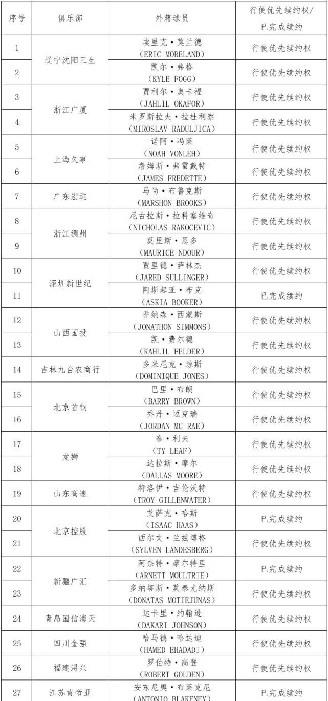 来源:24直播网07-19 15:3324直播网07月19日讯 ,CBA联盟官方公布了新赛季CBA各支球队行使外援续约权的情况,某种程度来说,球队是否对于外援使用优先续约权也被视为球队是否会留下外援的关键,毕竟一旦放弃优先续约权,外援将进入自由市场,应该没多少球队闲到给自己找对手抬价送外援大合同。