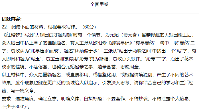 来源:24直播网06-07 14:4024直播网06月07日讯,高考作文出炉,这其中有我们非常熟悉的题材,比如“全国乙卷”的北京双奥之城,2008年北京奥运会和2022年北京冬奥会的题材,当然也有令人感到头疼的题材,目前在网络上最火的就是“全国甲卷”的红楼梦题材,指的是大观园竣工众人给园中桥上亭子的匾额题名的事情,根据这个材料,写一篇不少于800字的作文,几乎公认的今年高考作文最难的一个题材。