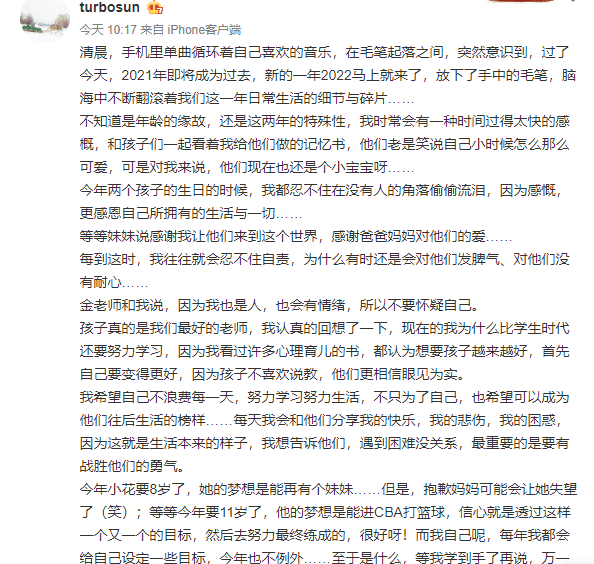 孙俪的原文是:“等等今年要11岁了,他的梦想是能进CBA打篮球,信心就是透过这样一个又一个的目标,然后去努力最终练成的,很好呀!”