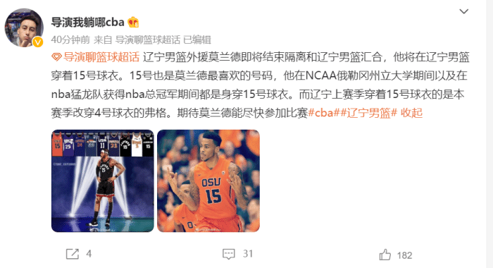 来源:24直播网11-07 20:4424直播网11月07日讯 ,据媒体人导演我躺哪cba报道,辽宁男篮外援莫兰德即将结束隔离和辽宁男篮汇合,他将在辽宁男篮身着15号球衣。