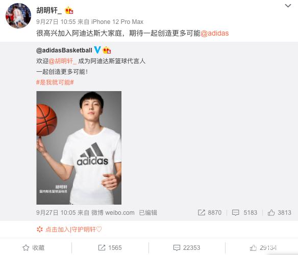 另外胡明轩颜值还高,可以说有不少女性粉丝喜欢他,这其中还包括了日韩不少球迷,性格也不错,一直以来人设都非常棒!但这件事可能导致他人设崩塌,他9月27日就在微博宣布签约阿迪了,其实球员签约体育品牌属于个人行为,只不过因为处于“敏感期”所以网络对于胡明轩签阿迪一事不依不饶!