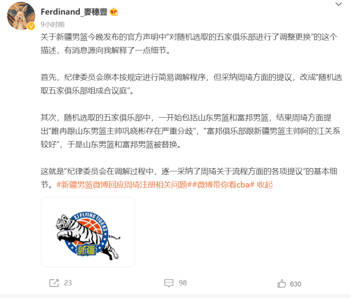 关于CBA和中国篮协的调解,此前媒体人和记者爆料了很多信息,但大致归结为“调解无结果”也就是说截止到现在,官方也不知道如何解决这件事,之前由5家俱乐部高管组成了合议庭来审理这件事,今日有媒体人再次爆料相关细节,这5家俱乐部中包括山东队,但周琦团队直接让对方退出了合议庭,这是怎么回事呢?