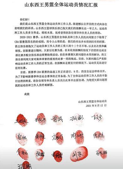 在9月3号,有媒体上传了一张山东男篮多名球员集体讨要薪水的照片。上面有10几位球员的签字和手印,称山东西王已拖欠球员一年的薪水。