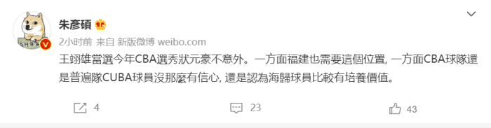 每年的状元都是备受期待的,今年是NCAA归来的王翊雄,他被福建队选中,宋翔等记者在选秀大会前就说过他很大概率成为状元!原因是福建队缺少内线,而宝岛名嘴朱彦硕则在社媒上发表看法,认为国内体育圈普遍认为NCAA回来的具备更高的可塑性和培养价值,通俗讲就是镀金回来“高人一等”