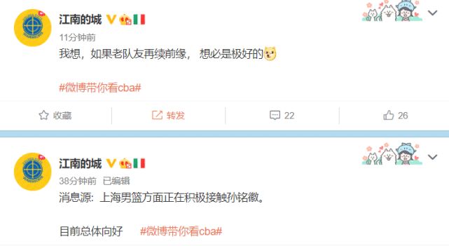江南的城写道:“消息源: 上海男篮方面正在积极接触孙铭徽。目前总体向好。”随后他再度写道:“我想,如果老队友再续前缘, 想必是极好的。”前一天,该媒体人刚刚透露,上海男篮仍在积极接触两名南方球队后卫。