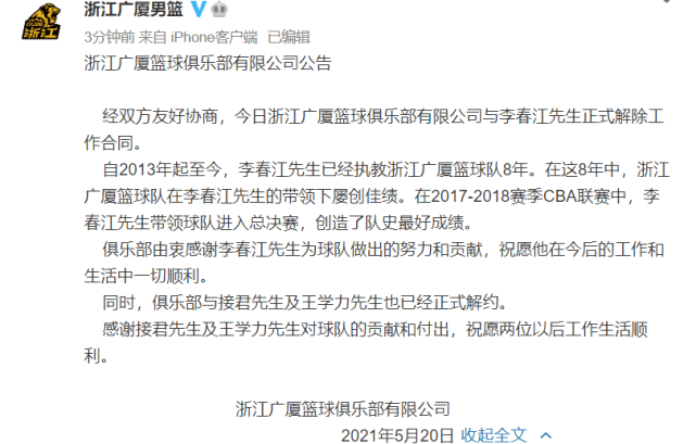 广厦男篮官方写道:“经双方友好协商,今日浙江广厦篮球俱乐部有限公司与李春江先生正式解除工作合同。自2013年起至今,李春江先生已经执教浙江广厦篮球队8年。在这8年中,浙江广厦篮球队在李春江先生的带领下屡创佳绩。在2017-2018赛季CBA联赛中,李春江先生带领球队进入总决赛,创造了队史最好成绩....同时,俱乐部与接君先生及王学力先生也已经正式解约。”