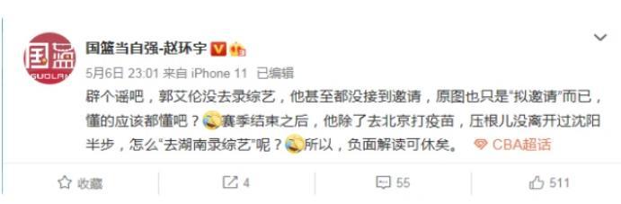 面对谩骂,这一次郭艾伦并没有回击,反倒是著名的篮球媒体人赵环宇站了出来帮助郭艾伦发声。在社交媒体上,赵环宇表示:辟个谣,郭艾伦没去录综艺,他甚至都没有接到邀请,原图也只是“拟邀请”而已,懂得应该都懂吧,赛季结束之后,他除了去北京打疫苗,压根没有离开沈阳半步,怎么去湖南录综艺呢?所以,负面解读可休矣。