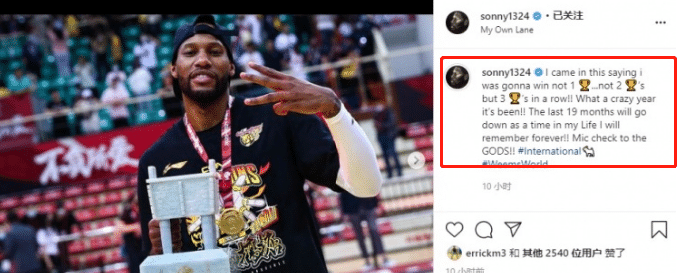 威姆斯更新了社媒庆祝夺得3连冠,而且还配上一个“历史最佳外援(International,山羊的英文GOAT,通常代指历史最佳)”的标签。而威姆斯还写道,“我来的时候就说过,我要赢得不止1个,2个,而是连夺3个总冠军。多么疯狂的一年,过去的19个月将成为我一生中永远铭记的时光”。