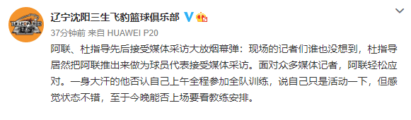 值得一提的是阿联在昨日乘坐班机正式抵达了赛区,阿联在今日进行了简单的投篮训练,阿联还被作为球员代表接受了媒体采访,他表示自己并没有全程参加球队训练,自己只是简单获得了一下,但是感觉还不错,至于今晚是否登场还要教练安排,杜峰随后谈到阿联登场时表现,要看阿联的情况而定