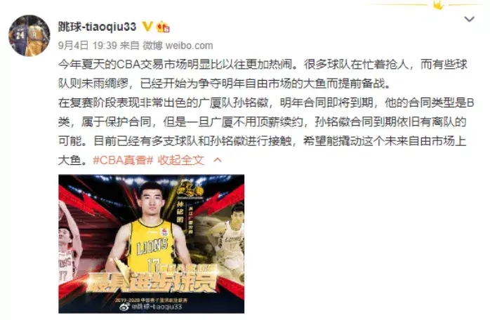 有多方消息源隐晦证实,孙铭徽最有可能的新下家是首钢,他们队内还有两个顶薪名额。