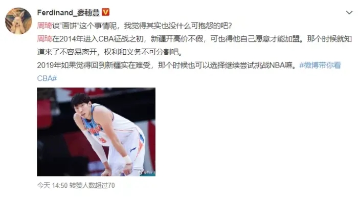 但国内媒体人麦穗丰看不下去了,怒怼周琦有什么可抱怨的?当年接受新疆肥约时不知道很难走?权利和义务不可分割。