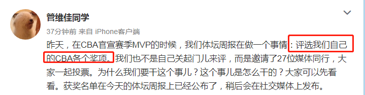 值得一提的是,国内知名媒体《体坛周报》做出了一项重要的决定,将独立评选CBA各项大奖,而且非常正式,将邀请27位媒体记者来进行投票。据《体坛周报》篮球媒体人和解说员管维佳在社媒上透露,《体坛周报》将评选CBA各个奖项,也不是关起门自己选,而是邀请了27位媒体同行,大家一起投票。而管维佳也发布长图说明为何这样做。