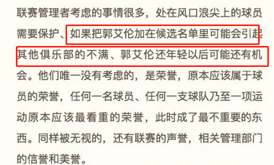 而且,据管维佳爆料,联赛管理层考虑的事情很多:处于风口浪尖上的球员需要保护,如果把郭艾伦加入候选名单可能会让其他俱乐部不满,郭艾伦还年轻,以后可能还有机会。