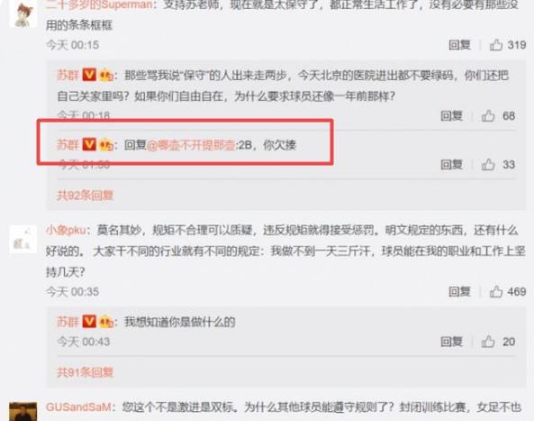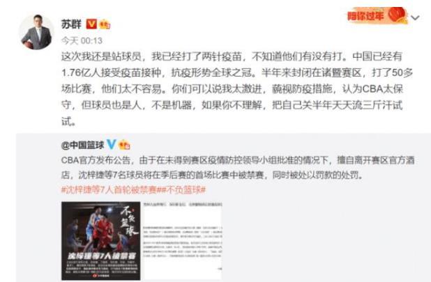 在社交媒体上,苏群老师表示,这次我还是站球员(这边)。苏群老师表达的大概是,我们的抗疫工作做得很好,半年来,球员封闭在赛区,打了50多场比赛,他们太不容易你们可以说我太激进,藐视防疫措施,认为CBA太保守,但球员也是人,不是机器,如果你不理解,把自己关半年天天流三斤汗试试。显然,苏群老师认为CBA防疫措施太严格,球员偶尔放松还是能够接受的。