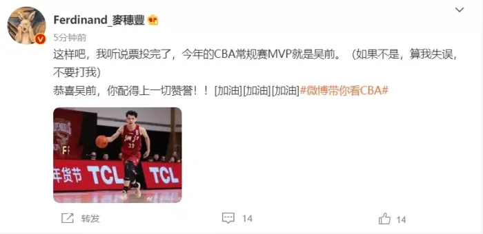 篮球先锋报记者麦穗丰今日更新个人社媒动态,表示媒体投票已经完毕,自己听说今年CBA常规赛MVP是吴前。