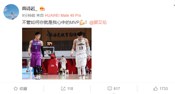 山东男篮的球员高诗岩在社交媒体上发布了一张自己和郭艾伦的合影,配文:“不管如何你就是我心中的MVP,郭艾伦”