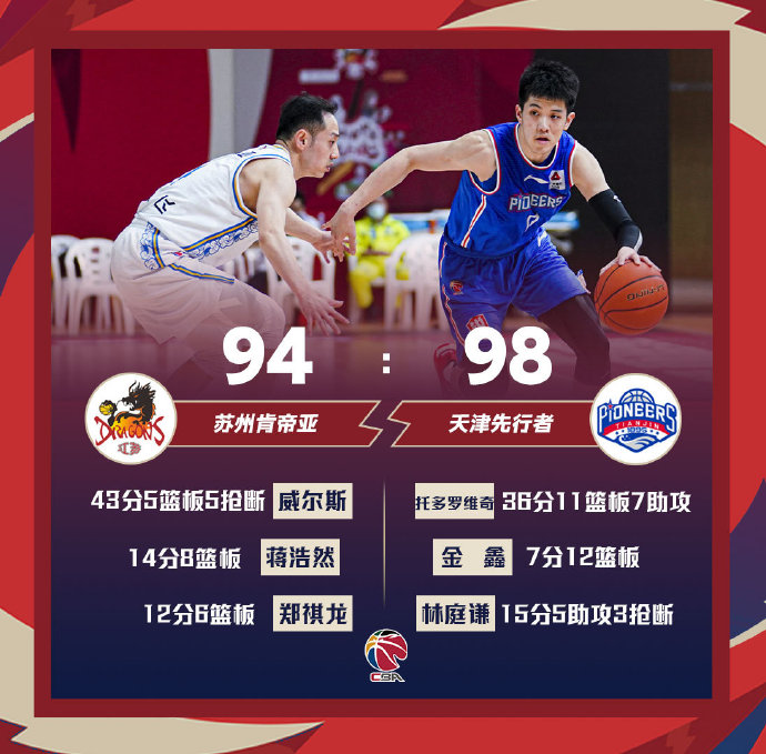 末节,威尔斯一步过掉防守后分球,刘晋廷勾手命中。林庭谦后场抢断,一条龙上篮得分。托多罗维奇左侧突破,左手打板命中。金鑫后场抢断,助攻林庭谦上篮得手。威尔斯接张稀然传球,三分干拔命中。威尔斯跳步来到油漆区,上篮打成2+1。临近比赛结束,江苏虽掀起追分高潮,但未能反超比分。全场比赛结束,江苏94-98不敌天津。