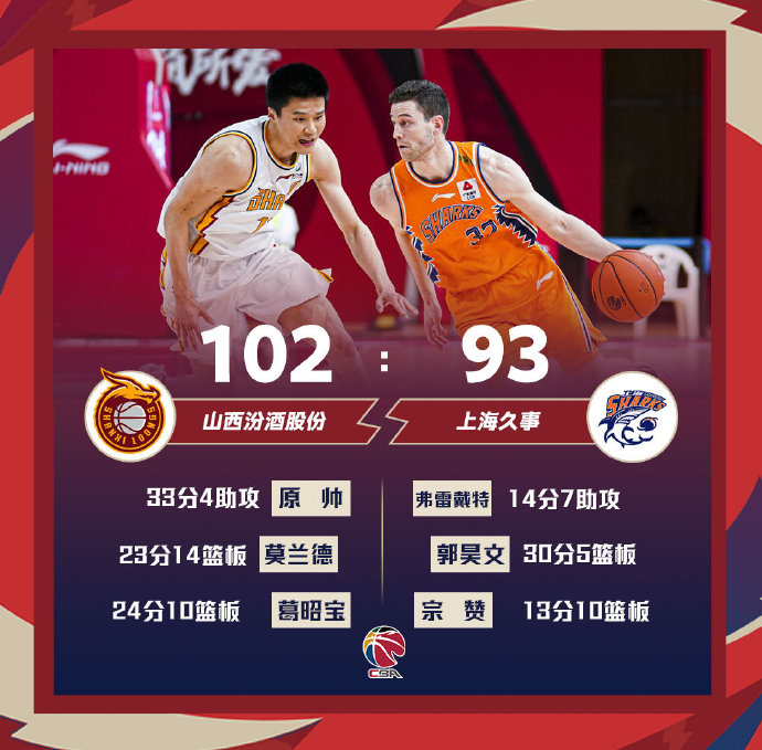 单节比分:23-23、21-21、30-24和33-15(广厦队在前)