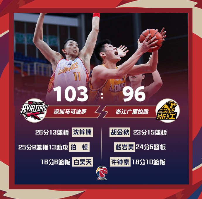 末节,孙铭徽后场长传,助攻冯欣上空篮得手。白昊天借掩护强突许钟豪,强行抛投打进。伯顿后场抢断,一条龙上篮得分。冯欣转身抹到篮下,上篮打进。胡金秋勾手不中,许钟豪篮下补篮得手。贺希宁直杀篮下后分球,沈梓捷跟进双手暴扣打成2+1,为深圳锁定胜局。全场比赛结束,深圳103-96击败广厦。