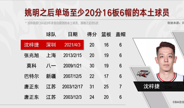 本赛季的深圳男篮成为最大黑马,在赛季开始前流失的主将,同时邱彪指导第一次以正式主帅的身份执教球队,外界并不看好深圳男篮。这样的情况下沈梓捷站出来承担了责任,他在本赛季表现抢眼,从上个赛季的场均14.1分7.8板1.7助1.5帽,到本赛季的场均17.0分11.5板2.4助2.9帽,沈梓捷的进步也是有目共睹的。同时除了数据层面,沈梓捷带队能力以及关键时刻的表现、战斗精神都让这位97年的球员成为了深圳男篮的核心。