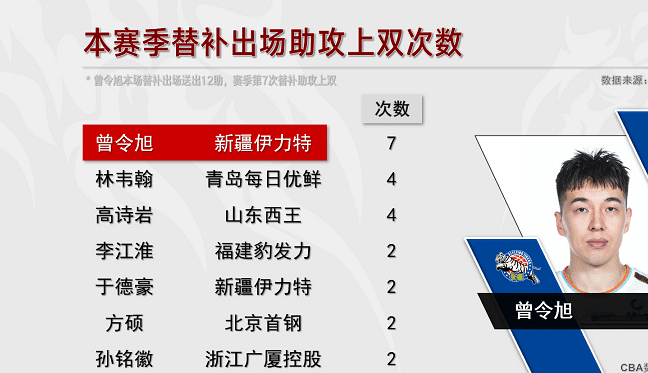 曾令旭作为新疆男篮的“镇队之宝”本赛季有不俗的发挥,他出任替补,本赛季已经有7次以替补身份出场助攻上双,成为本赛季达成此成就次数最多的球员。赛季迄今为止,曾令旭场均12.5分3.0篮板7.3助攻1.0抢断。常规赛最佳第六人是上个赛季新增的奖项,第一届属于北京首钢的方硕,今年曾令旭表现稳定而出色,不出意外,常规赛最佳第六人属于曾令旭。