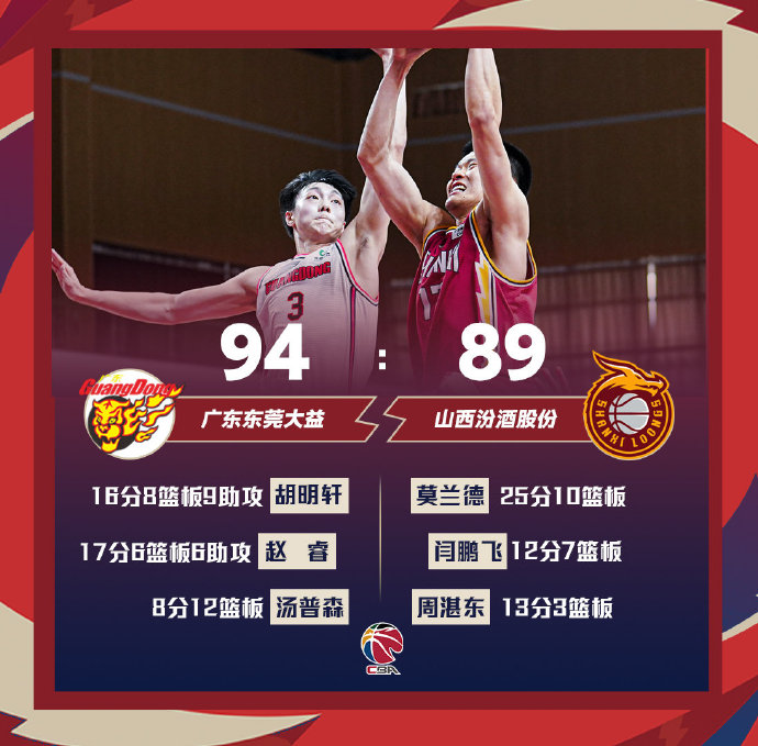 加时赛,胡明轩45度三分射中,苏伟上篮得手,张旭完成行进间抛投,胡明轩二次进攻得手锁定胜局。最终广东94-89战胜山西。