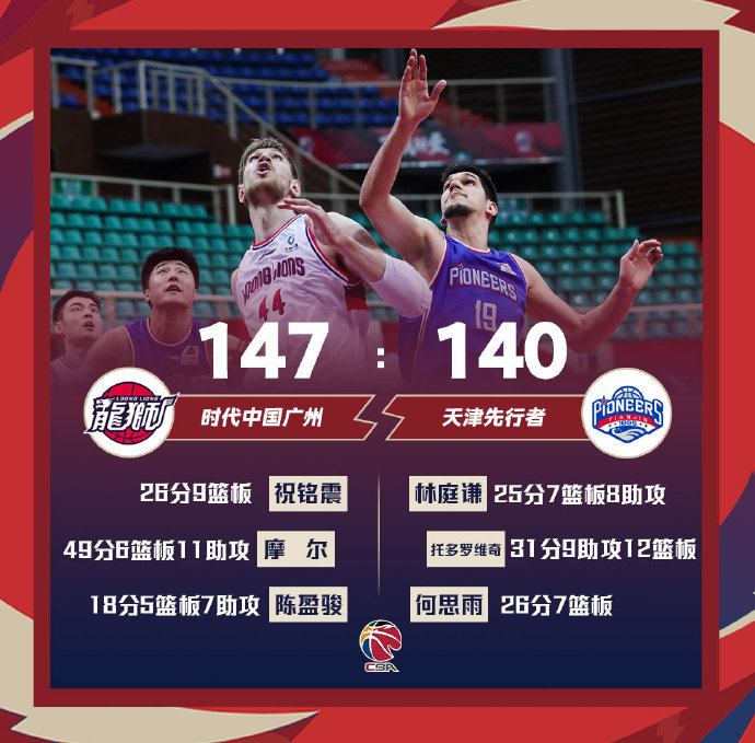 广州:摩尔49分11助攻6篮板,郑准13分5篮板,哈斯10分11篮板,王政博11分,陈盈骏18分5篮板7助攻4抢断,祝铭震26分9篮板。
