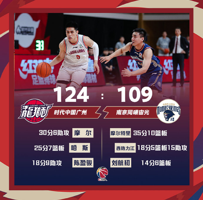 广州124-109大胜同曦 摩尔30+6 陈盈骏18+9 摩尔特里35+10
