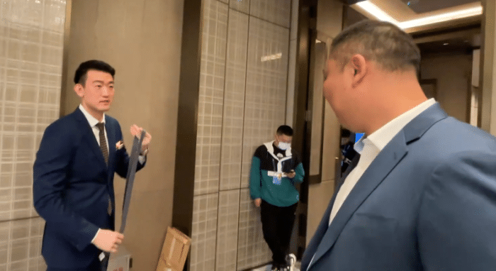 韩德君和张镇麟等人一起来到的酒店,韩德君依旧穿的是辽篮元素的衣服。