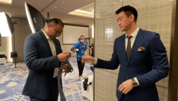 王晗自己不会,一旁的广厦主帅王博衣服是有领带的,他开始给王晗打领带,记者也调侃手法很专业啊。很快王博就把领带打好了,然后给到王晗。王晗指导在自己的脖子上比划了说“正好”然后就要走,记者问干嘛去呢,戴上啊。王晗称得找个有镜子的地方对着打。
