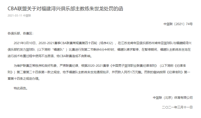 来源:24直播网03-12 18:5924直播网讯 北京时间3月11日,CBA官方开具罚单,针对福建主帅朱世龙在对阵江苏比赛中使用不当言语,做出通报批评以及罚款1万元的处罚。此前,朱世龙在福建对阵江苏比赛暂停期间,曾用自己颇具感染力的普通话,说出了一些比较搞笑的言语,加上翻译的“推波助澜”,一度“走红”网络。