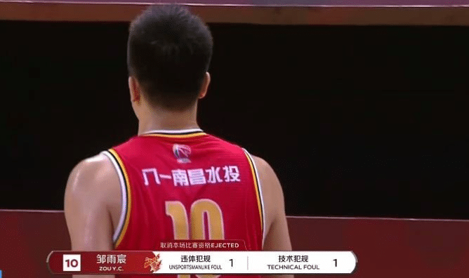 当时邹雨宸被吹进攻犯规,裁判看过回放后改为邹雨宸违体犯规,他扬肘打到了他现在北控的队友王少杰的下巴,邹雨宸看到这样的判罚之后感到非常不满,随后他朝着裁判鼓掌,这样邹雨宸又被追加了一个技术犯规,这样一个违体+一个技犯,邹雨宸被直接驱逐出场,而根据规定,他还要被禁赛一场。