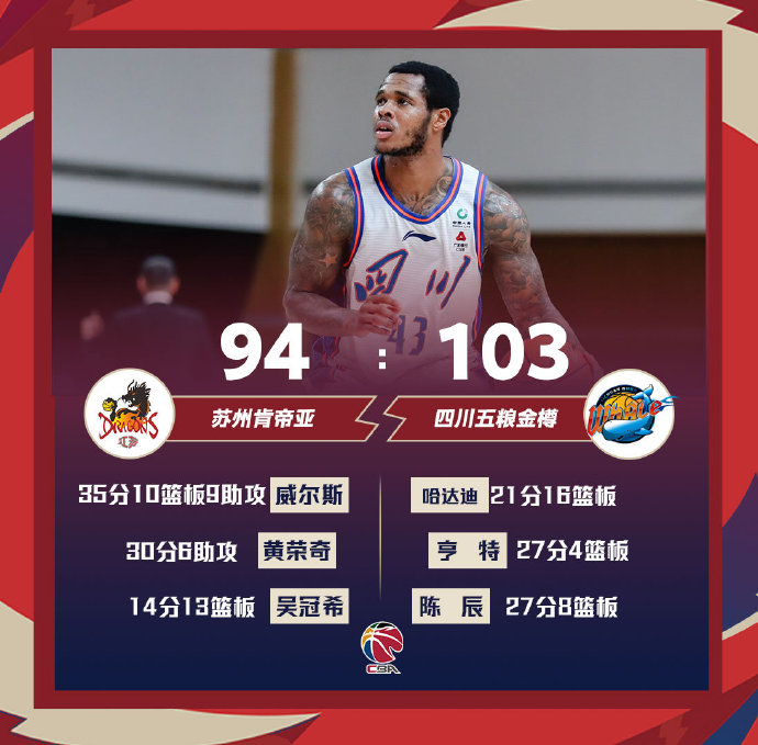 四川103-94战胜江苏 哈达迪21+16+7 陈辰27+8 威尔斯33+10+8