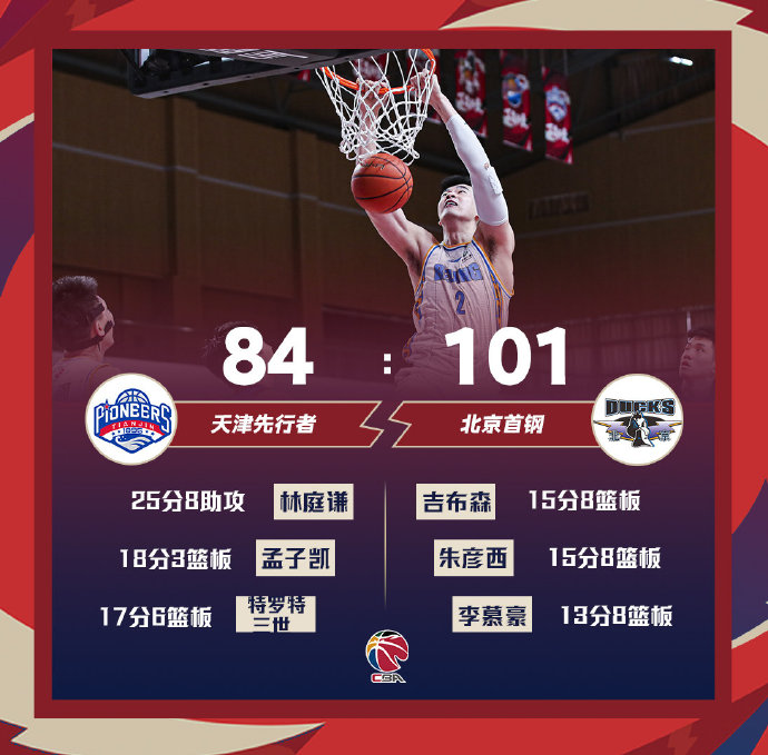 末节,张才仁垫步起飞,低手挑篮打板命中。何思雨强力突破,面对贾斯丁-汉密尔顿艰难打进。周仪翔闪转腾挪,左手挑篮颠进篮筐。林庭谦追身三分自信出手,篮球空心入网。之后北京稳扎稳打,始终保持两位数领先,天津无力回天。全场比赛结束,天津84-101负于北京。