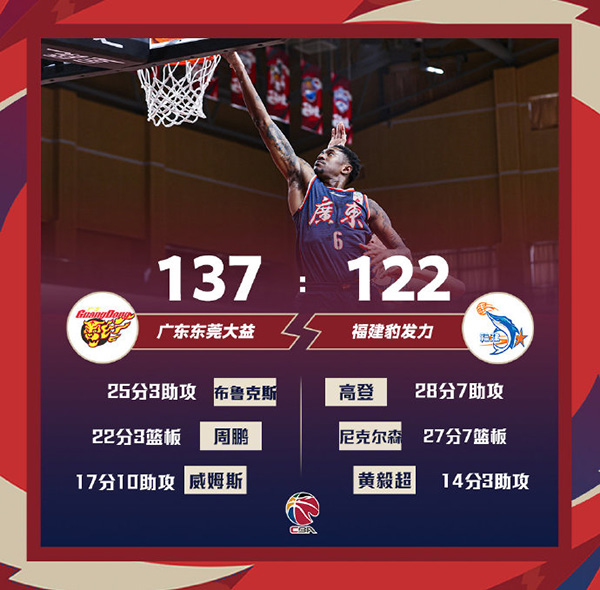 末节,尼克尔森接连强攻砍分,帮助福建男篮追分,而广东男篮也利用威姆斯与周鹏的火热手感连续砍分,两队的分差一直在18分左右。到了本节中段,福建男篮在进攻端再度陷入停滞,广东男篮通过曾繁日与威姆斯的强攻将分差再度扩大至20分,比赛也随之进入到暂停阶段。暂停回来后,尼克尔森彪中一记三分,帮助福建男篮继续苦苦追分,而广东男篮则是连续轻松回应,在曾繁日强攻得手后,广东男篮将分差扩大至25分,直接打停福建男篮。暂停回来后,虽然福建男篮屡屡命中三分,但是将分差一直保持在20分左右,并未给福建男篮任何追近比分的机会。最终,广东男篮以137-122战胜福建男篮。